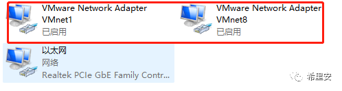 按理说这会,重启一下网络systemctl restart network就可以连接外网,ping通类似baidu.com了呀,那就奇怪了,没做什么操作呢,怎么就不行了,我又确认了下虚拟机,发现桥接网络没有自动连接,我在网络共享中心看了一下,也没有创建Vmnet1和8的虚拟卡,这能通网才怪了。