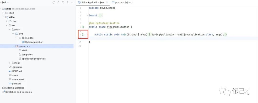 我们可以看到,我们的这是个最简单的springboot的项目,只有一个启动类的main方法,点击main方法旁边的debug启动项目