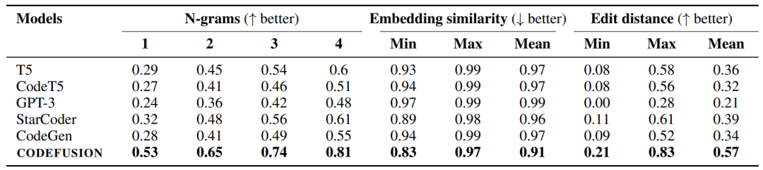 CODEFUSION 相比自回归模型,能够产生更多样化的代码(更高的 n 元语法分数、更低的嵌入相似性和更高的编辑距离)