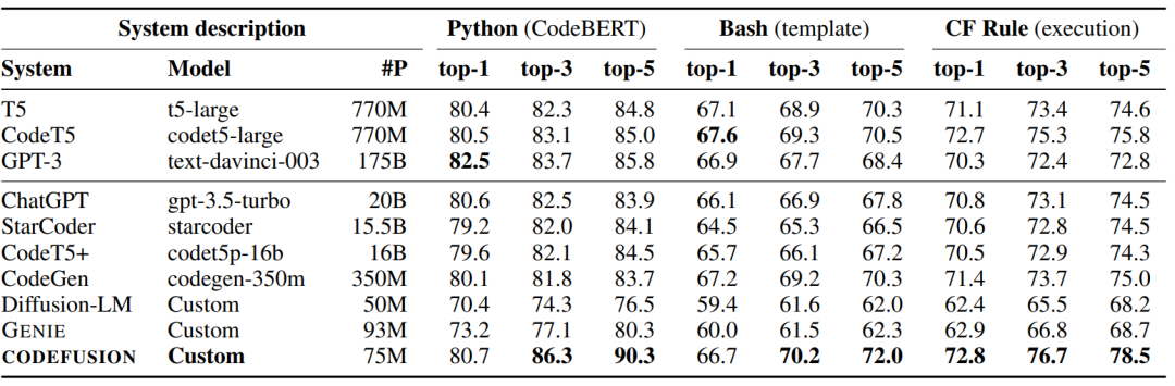 如下图所示,可以发现CODEFUSION-75M效果超过了ChatGPT、StarCoder、GPT-3等众多几十亿、上百亿参数的模型。