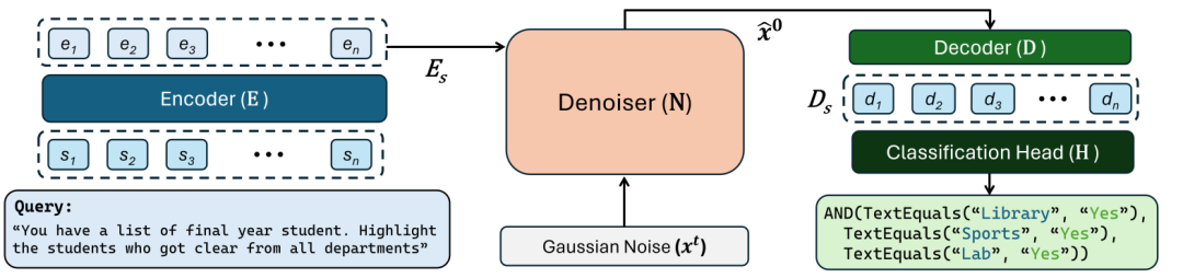 其中,CODEFUSION的架构主要由编码器(E)、降噪器(N),解码器(D)三大Transformer组件组成,外加一个分类头