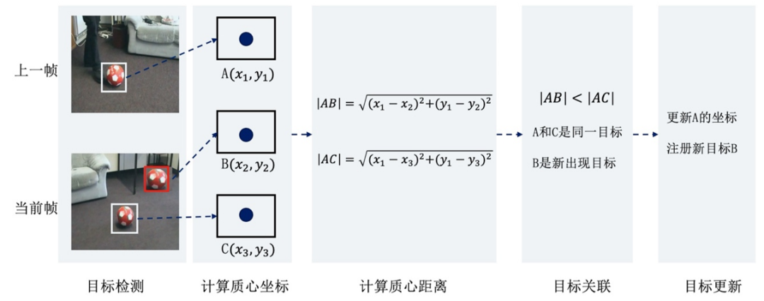 但是,“通过目标识别进行目标关联”需要在每一帧图像中,提取出每一个目标的特征,这需要大量的计算资源,同时还需要稳定的特征提取器,在实际场景中很难做到,因此,通常采用其他方法进行目标的关联,如常用的质心法。
