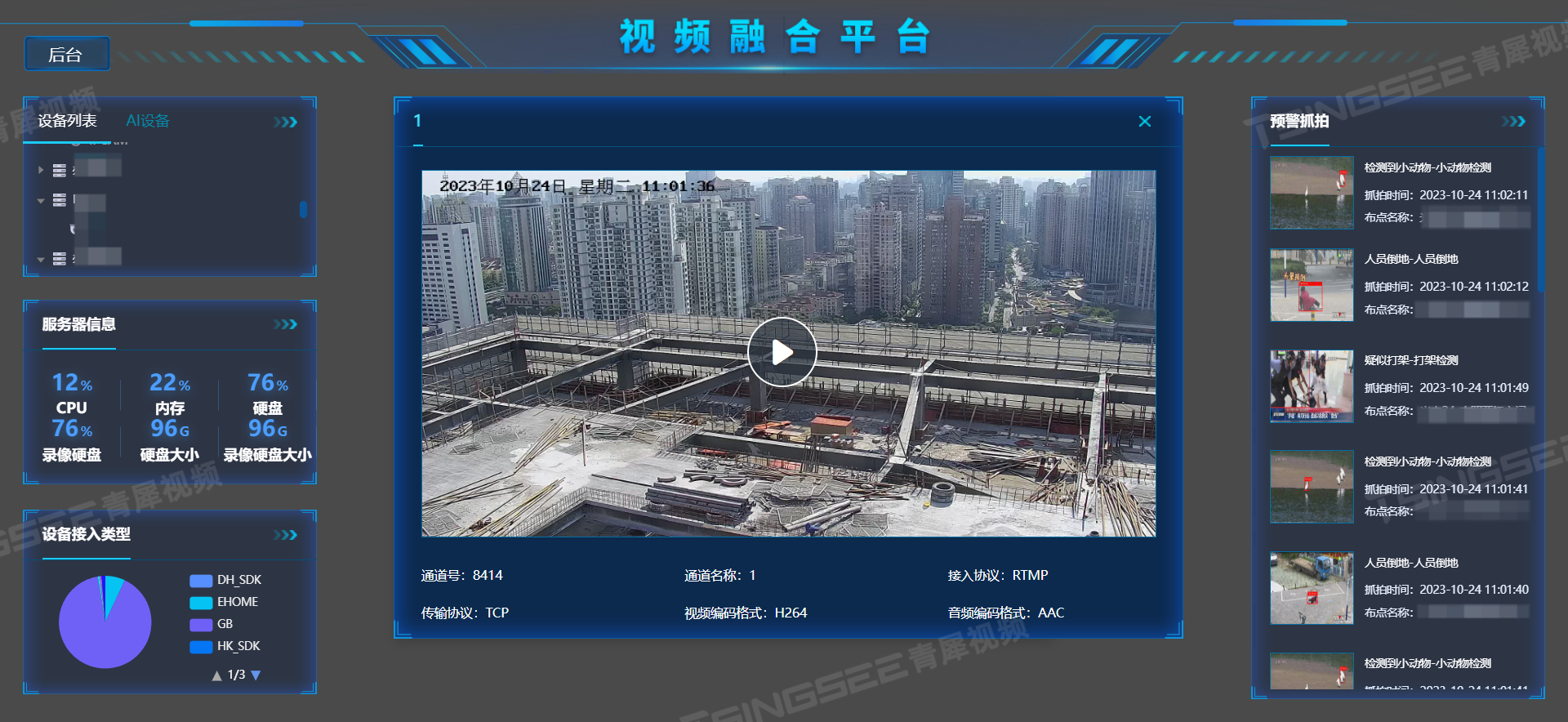 安防视频监控EasyCVR平台不仅可以接收告警消息,还支持对告警消息进行分级、分类和检索、查询。此外,平台还可以提供安防视频监控能力,通过对现场监控设备的统一集中接入和汇聚管理,能实现对工厂、工地等场所的可视化视频监管,如:实时远程视频监控、视频录像、存储与回放、语音对讲、智能告警、云台控制等。
