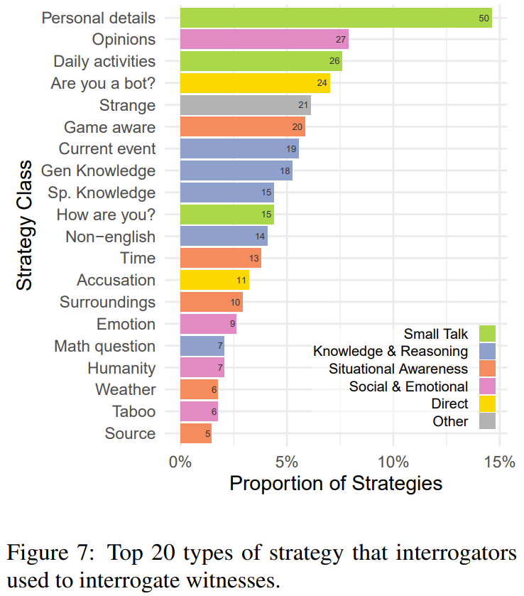 图 7 给出了被使用最多的 20 种策略。其中最常见的策略是闲聊(27%),也就是问见证者的日常生活和个人细节。