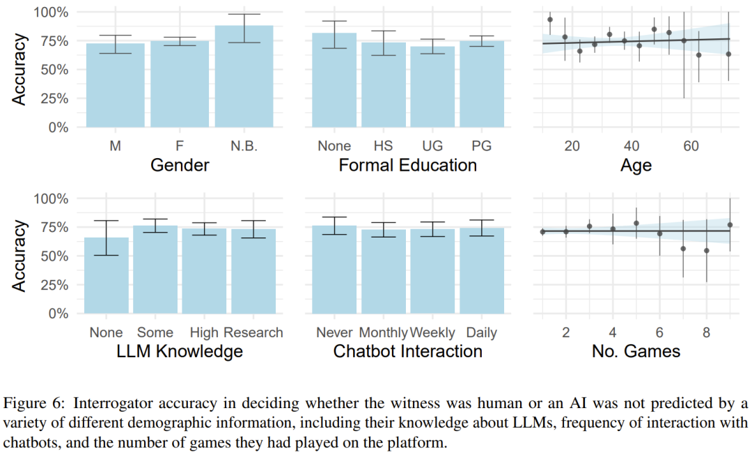 但他们表示并未发现这些因素对准确度有明显影响。这里的准确度是指审问者正确猜出对方是人类或 AI 的比例,见图 6。