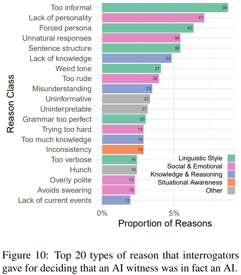 审问者在做出正确判断时所给出的理由中往往有语言风格一项。因为尽管 LLM 的训练语料中包含大量不同风格的文本,但生成与语境风格一致的内容还依然是一大难题。审问者会发现 AI 模型生成的结果要么过于正式,要么就过于不正式;语法要么太好,要么就糟糕得不真实;要么过于冗长,要么就过于简练。