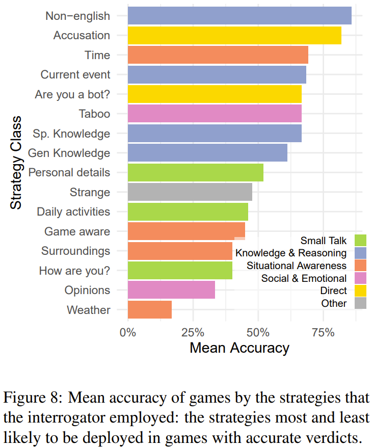 研究者分析了不同策略的有效性,给出了使用不同策略时的平均准确度(见图 8),可以看到,最可能成功的策略是让见证者说外语、询问时间或时事以及直接询问对方是不是 AI 或宣称对方是 AI。