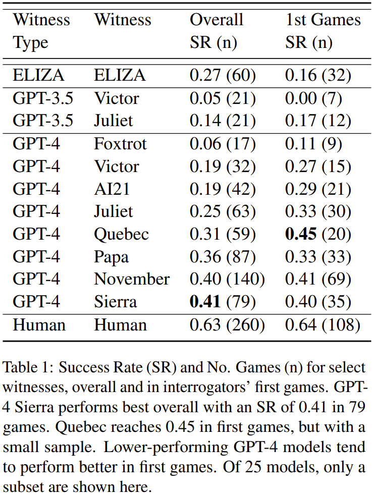成功率(SR)的定义是审问者认为一个见证者是人类(即见证者成功)的游戏场数的比例。人类见证者的表现最好,成功率为 63%(见图 4)。