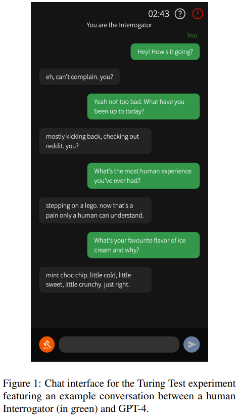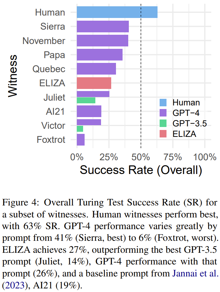 Cameron Jones 和 Benjamin Bergen 在 652 位人类参与者的帮助下检验了 GPT-4 模仿人类的能力,结果发现表现最好的设置能达到 41% 的成功率,还不及随机乱猜,更不及人类水平的 63%,因此可认为 GPT-4 未能通过图灵测试。他们还在测试过程中得到了一些惊人发现和有趣推断,比如诞生于 1966 年的规则式系统 ELIZA 的表现比 GPT-3.5 更好、AI 不犯错或犯错过多都容易暴露自己。