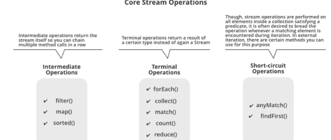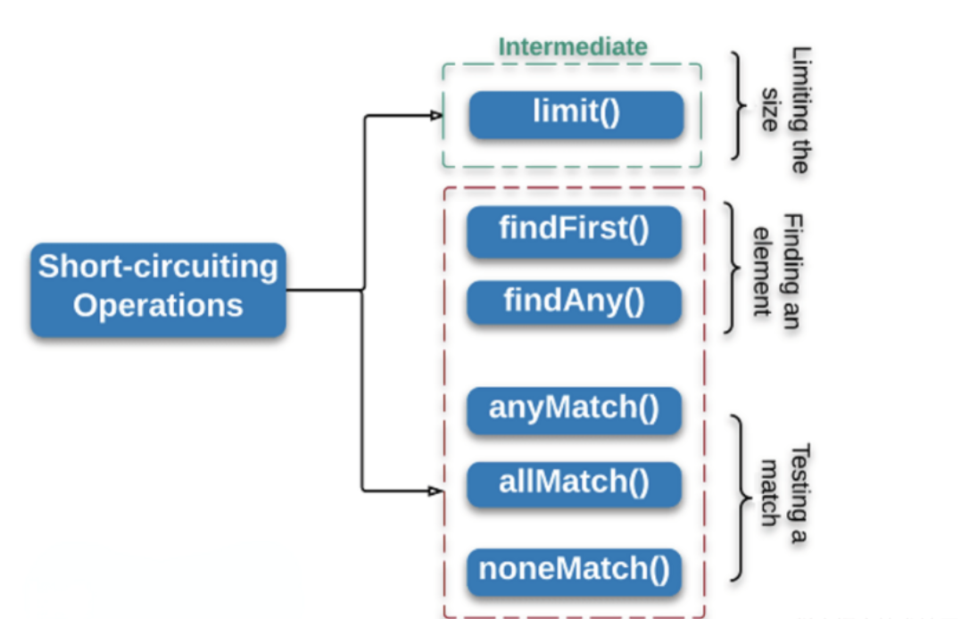 首先,Steam 操作,是分类的。总体上分为两大类,即中间操作(Intermediate operations)和结束操作(Terminal operations)。同时需要注意,还有一种特殊的操作即 Short circuiting 操作,中间操作和结束操作中都有这种操作。
