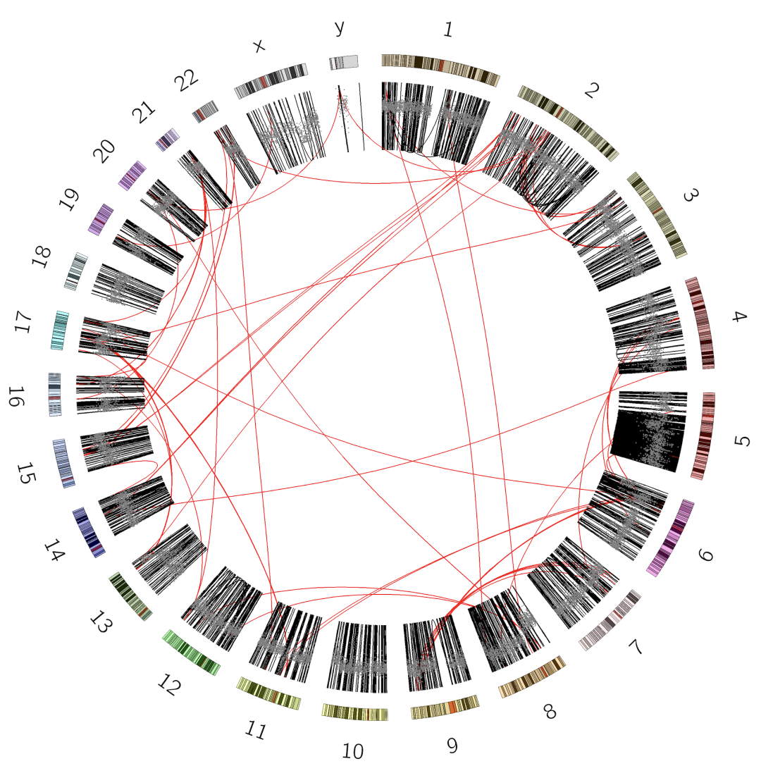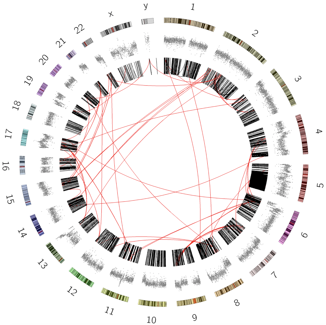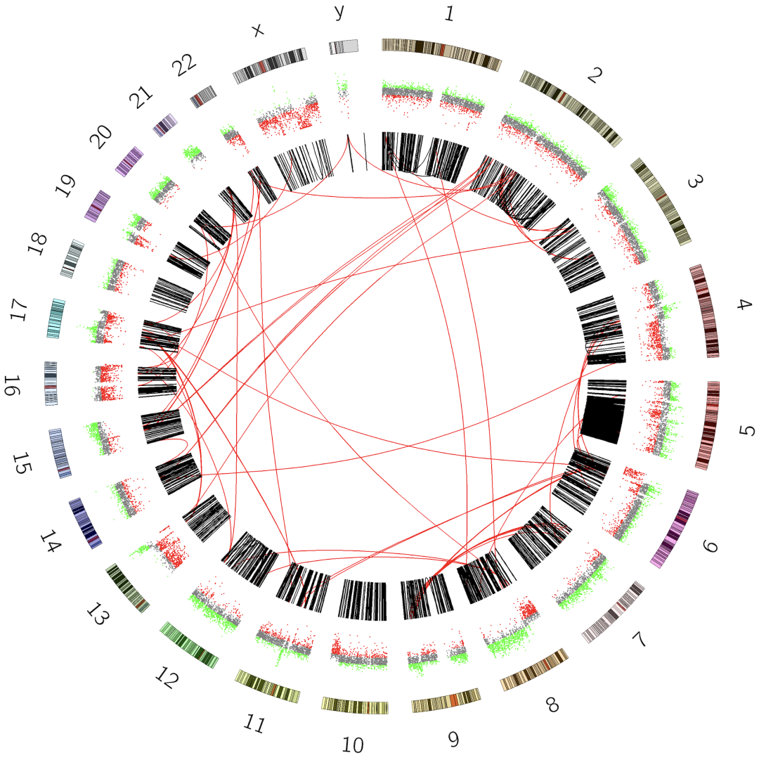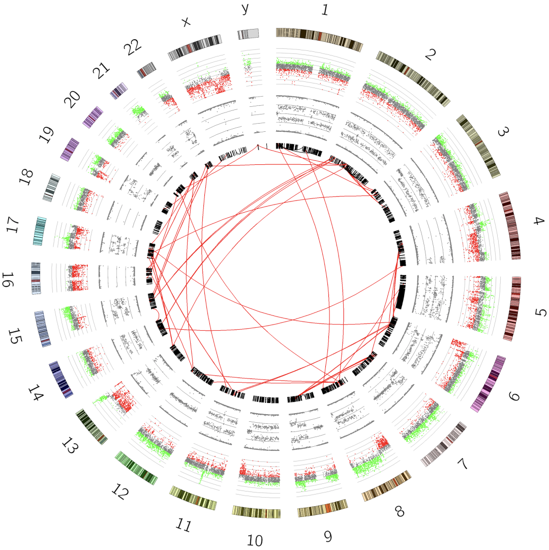 在这篇文章中,各种来源的数据被整合到一个综合的Circos图中。下面我们就来复现这个图,首先我们先了解一下Circos的基础。