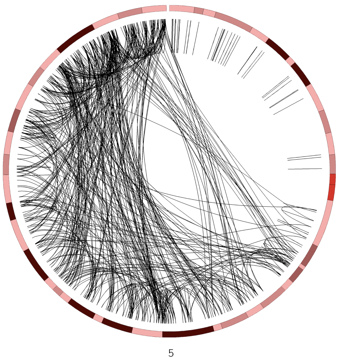 Circos(Krzywinski等人,2009年)是一个用于以圆形布局可视化数据的软件包。这使得Circos非常适合探索对象或位置之间的关系。Circos图表已经出现在成千上万的科学出版物中。尽管最初设计用于可视化基因组数据,但它可以根据任何领域的数据创建图表。