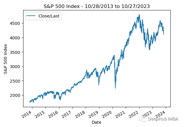 作为最后一个例子,让我们看看从2013年10月28日至2023年10月27日的标准普尔500指数真实数据: