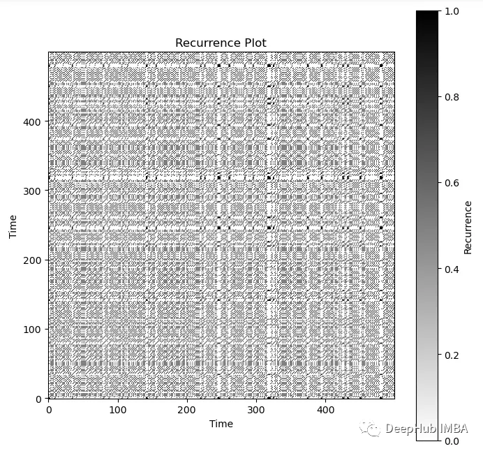 Recurrence Plots(RP)是一种用于可视化和分析时间序列或动态系统的方法。它将时间序列转化为图形化的表示形式,以便分析时间序列中的重复模式和结构。Recurrence Plots 是非常有用的,尤其是在时间序列数据中存在周期性、重复事件或关联结构时。