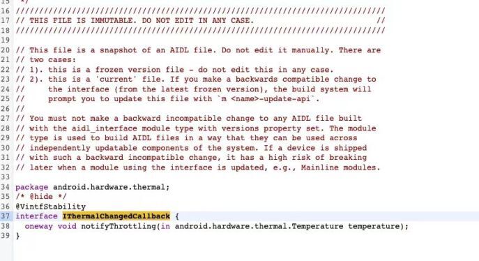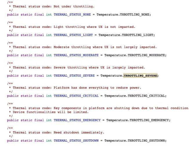 });但对于发热等级来说,壳温无疑是最为能够反应手机的发热情况的。可以看到 Android 系统的 API 实际上是提供了 AIDL 接口,可以直接注册 Thermal 变更事件的监听,获取到 Temperature 对象。但由于标识了 Hide API 。常规应用层是无法获取到的,在考虑好 Android 版本兼容性前提下,通过反射代理 ThermalManagerService 方式进行读取。
