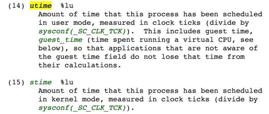 我们重点关注 14.15 位的信息,分别代表进程/线程的用户态运行的时间和内核态运行的时间。