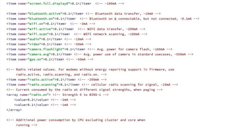 源码 Power_profile 文件中定义了每个系统服务状态下的电流量定义。