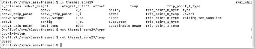 Android 是基于 Linux 基础上修改的开源操作系统,同样的在手机系统 sys/class/thermal/ 目录下存在以 thermal_zoneX 为代表各传感器的温度分区,以及 cooling_deviceX 为代表风扇或散热器等冷却设备。