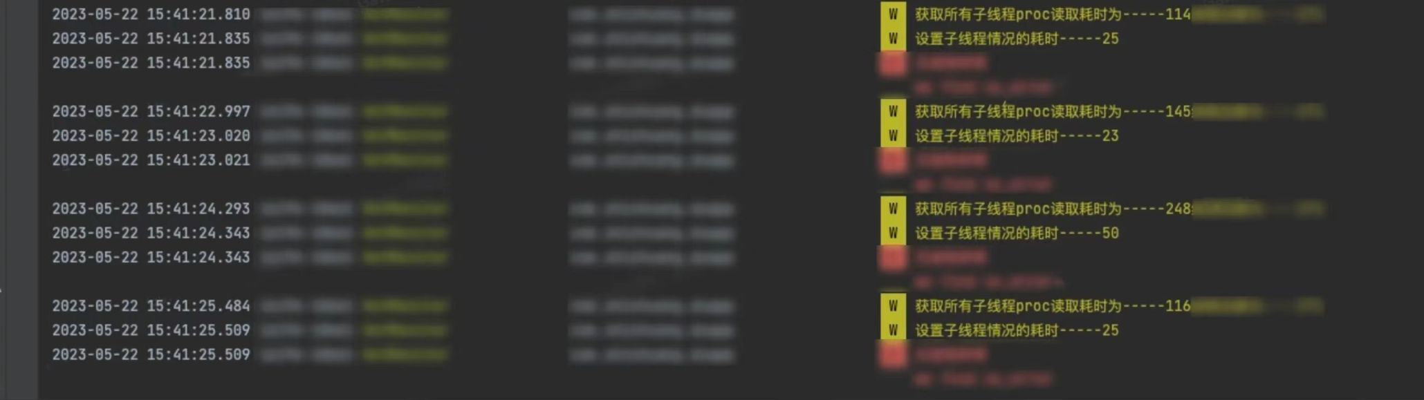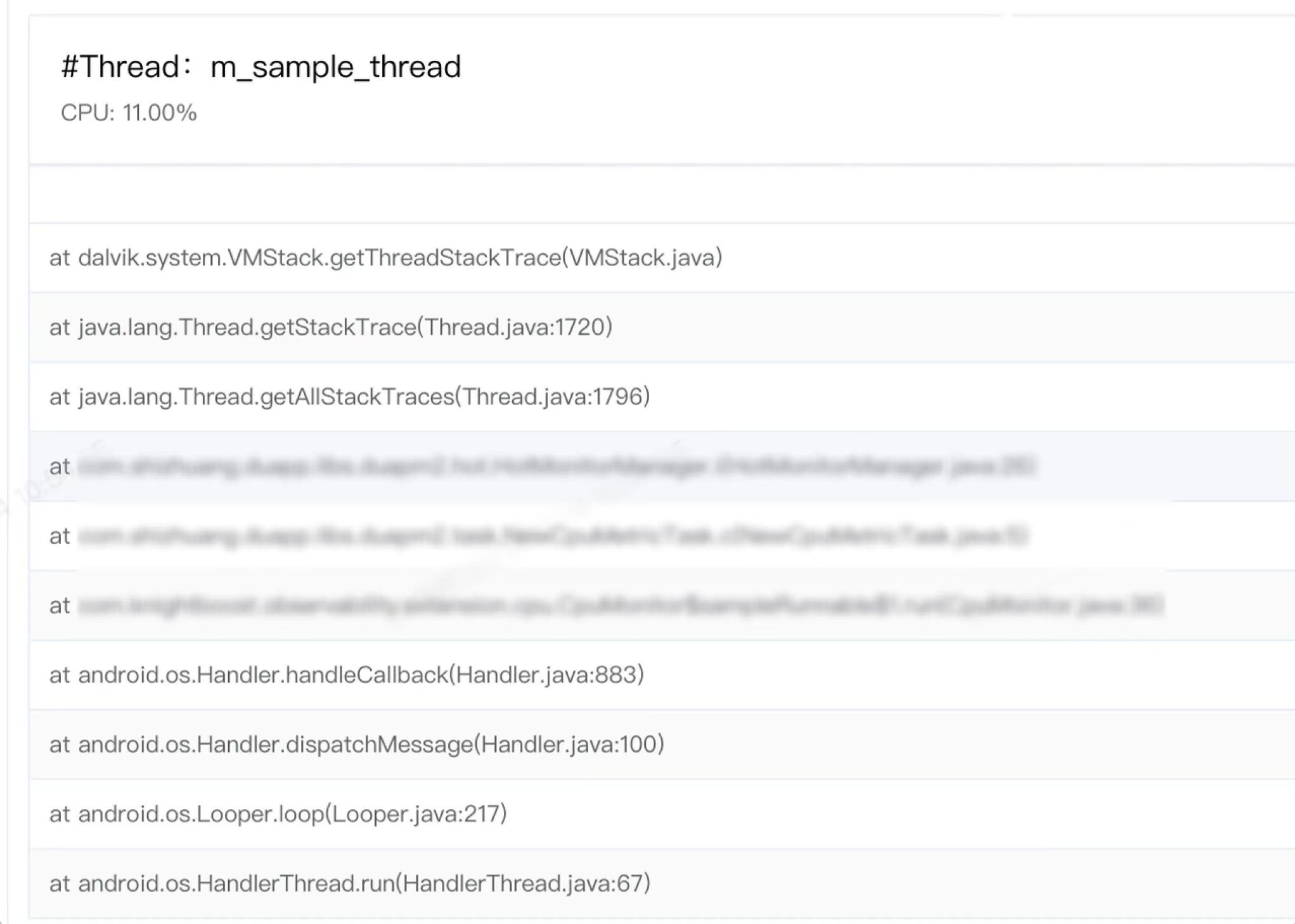 上文说到 在计算 CPU 使用率的时读取进程下所有线程的 Stat 文件,我们可以获取到子线程的 CPU 使用率,对其使用率进行倒排,筛选超过阈值(当前定义 50% ) 或 占用 Top N 的线程进行存储。由于堆栈频繁采集时机上是有性能折损的,故牺牲了部分的堆栈采样精度和准确性,在温度、CPU 使用率等指标超过阈值定义后,才开始采集 指定下发时间的堆栈信息。