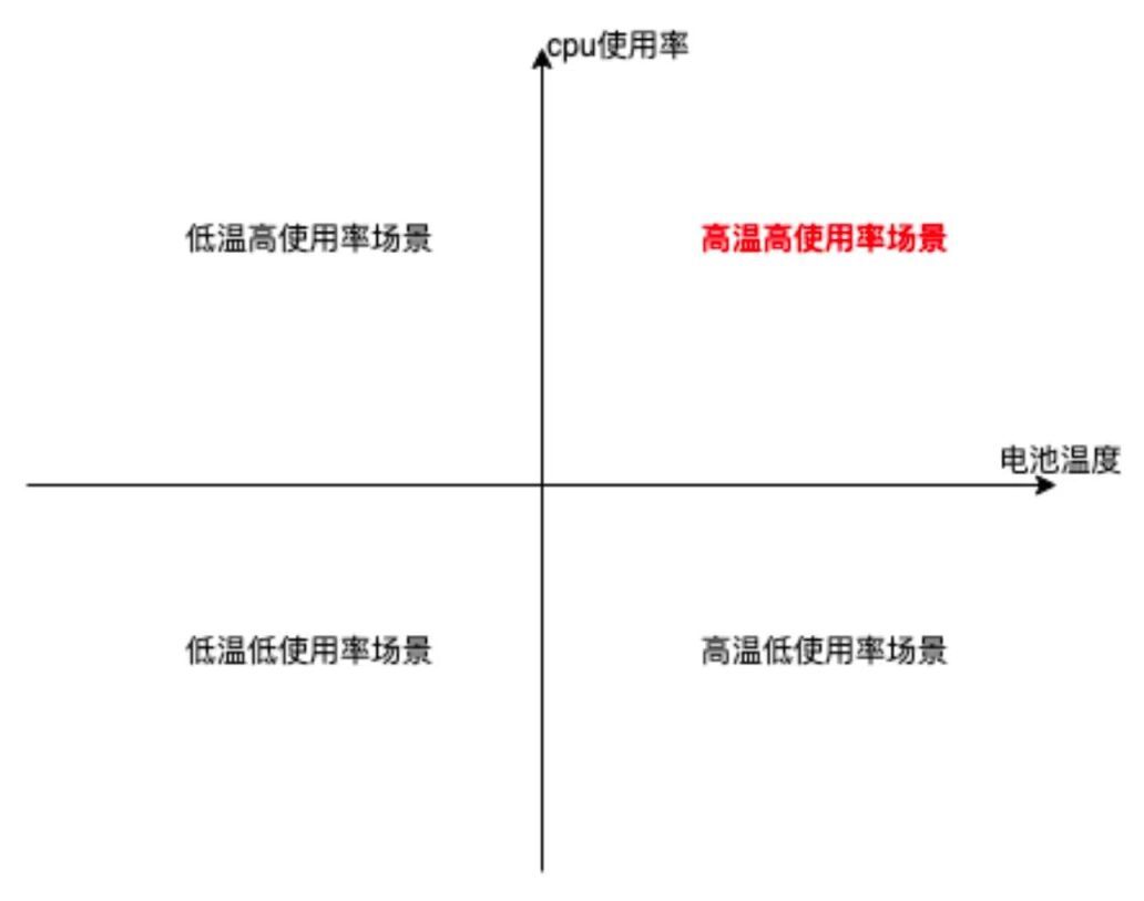 由于电池温度、CPU 使用率是针对运行时发热场景最直观的指标,且我们一期重点关注发热场景的治理,不针对元器件 Hook 等耗电场景进行持续深入分析,故当前得物侧是以电池温度、CPU 使用率为第一第二指标 建立核心的发热问题四象限,优先关注高温、高 CPU 的问题场景。