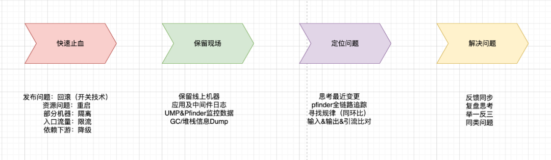 下面不是严格的顺序,需要根据实际情况调整可多路并行,比如清楚问题大概环节,先止血。如不清楚,报备分工,初步定位大概环节再快速止血。