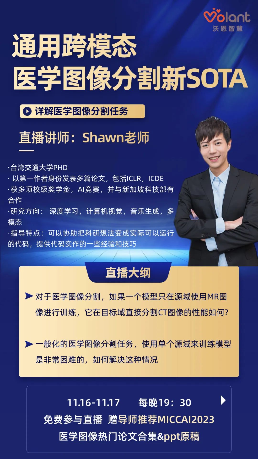 11.16-11.17日,我们邀请到台湾交通大学博士,多篇顶会一作作者,Shawn老师,为我们带来——通用跨模态医学图像分割新SOTA,为我们详解医学图像分割任务。