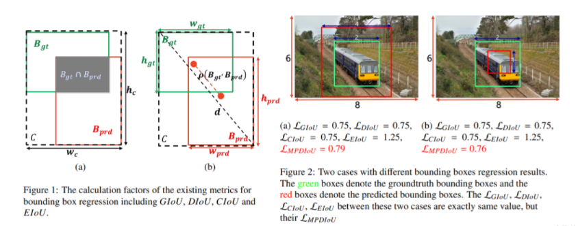 具有不同边界框回归结果的两种情况。绿色框表示真实边界框,红色框表示预测边界框。 这两种情况之间的 LGIoU 、 LDIoU 、LCIoU 、 LEIoU 的值完全相同,但LMPDIoU不同