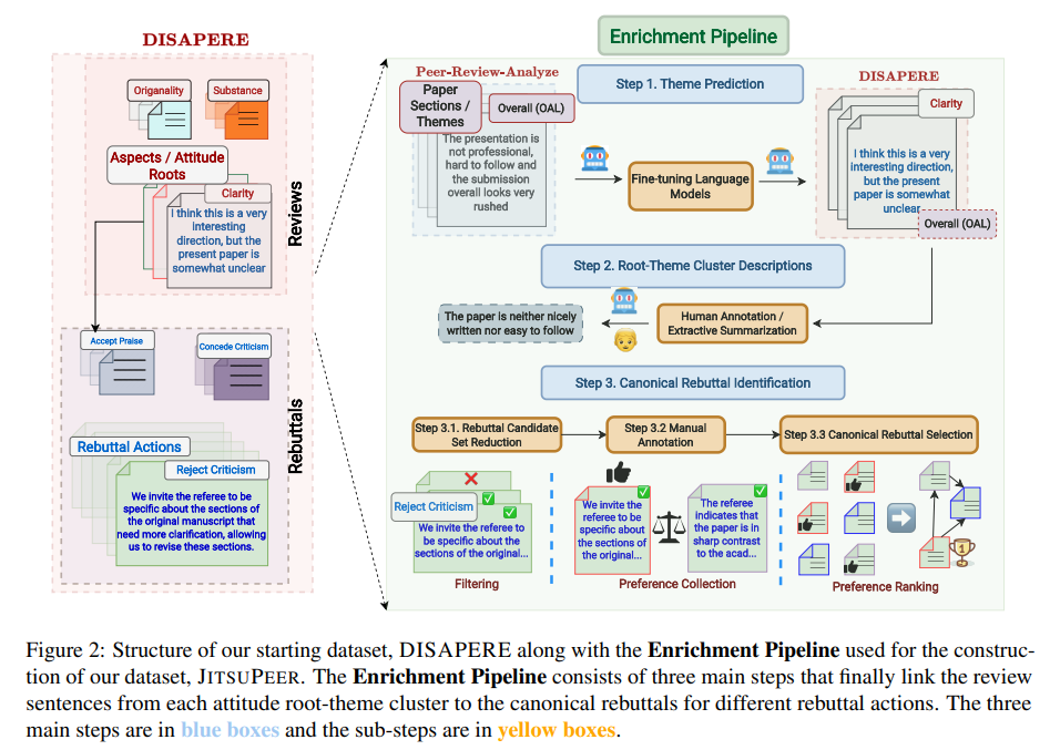 在这项研究中,研究团队的目标是创建一个详尽的语料库,其中审稿句子不仅被标注为态度根源和主题,而且还与特定反驳行动的典型反驳句子相连接。为了实现这一目标,研究团队采用了一系列方法来丰富DISAPERE数据集。