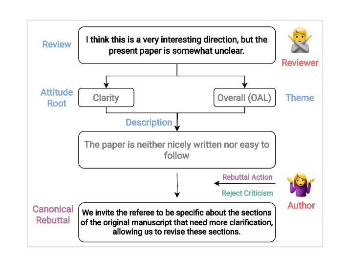 作者首先定义典型的rebuttal为:一种与潜在态度根源相一致并解决它们的反驳论点。它足够通用,可以作为模板用于许多相同(态度根源-主题)审稿元组的实例,同时表达特定的反驳行动。