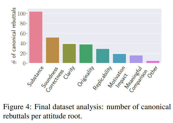 手动标注:在手动决定典型反驳方面,研究团队设计了一套方法:展示来自特定态度根源和主题集群的≤5个审稿句子,并将这些信息与特定的反驳行动配对。然后,他们随机选择两个反驳句子,这些句子与集群中的任一审稿句子相关,并对应于所选的反驳行动。标注者需要从这对反驳句子中选择更好的一个。对于每个(态度根源、态度主题、反驳行动)三元组的n个反驳句子,成对标注设置需要对n(n − 1)/2对句子进行评判。研究团队雇佣了两名计算机科学博士生进行这项任务。