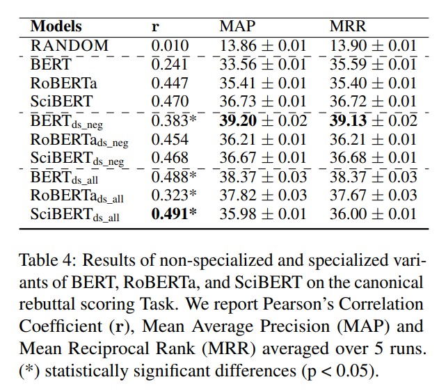 首先,他们使用了PEER-REVIEW-ANALYZE数据集来预测态度主题,即审稿句子中所涉及的论文部分。研究团队测试了不同的模型,包括通用模型和针对同行评审领域的专门模型,如BERT、RoBERTa和SciBERT。他们通过中间层的遮蔽语言模型(MLM)对这些模型进行了领域专门化处理,并在多个配置下进行了训练和优化。研究团队在变压器的顶部添加了sigmoid分类头,以进行微调,并对不同的学习率进行了网格搜索。他们基于验证性能采用早期停止策略,并在PEER-REVIEW-ANALYZE数据集上评估了模型的性能。结果显示,所有变压器模型的性能都显著优于基线模型,其中经过领域专门化处理的SciBERTds_neg模型表现最佳。