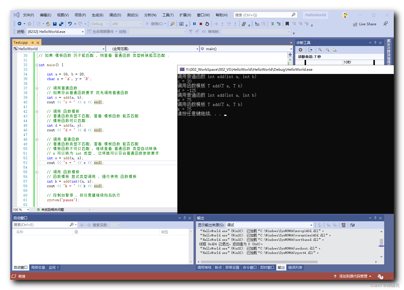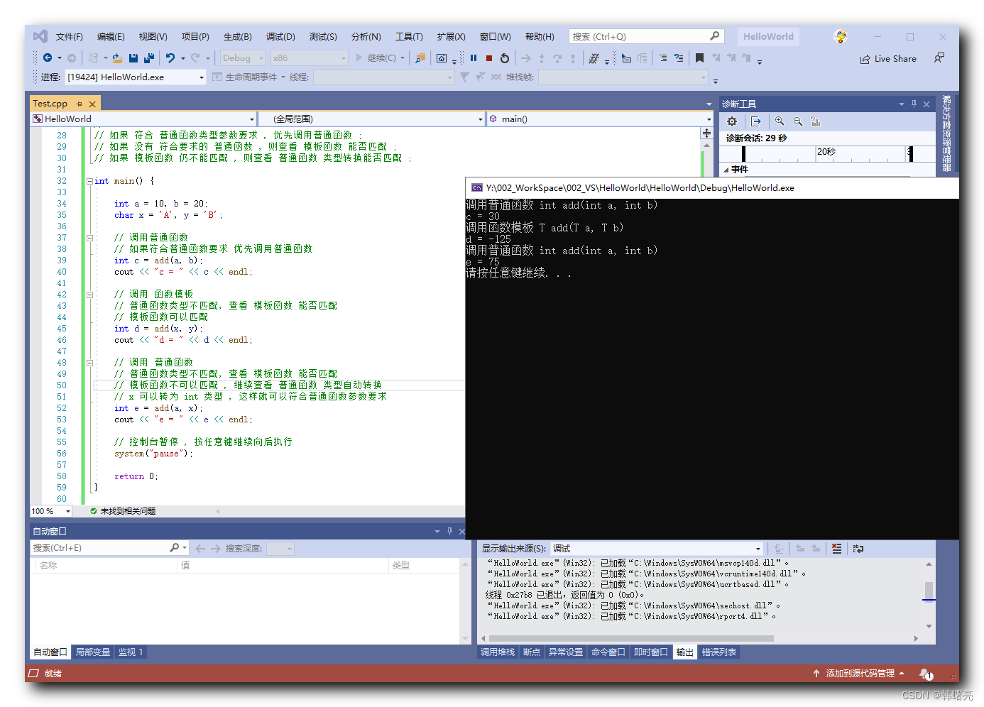 调用普通函数 int add(int a, int b) c = 30 调用函数模板 T add(T a, T b) d = -125 调用普通函数 int add(int a, int b) e = 75 调用函数模板 T add(T a, T b) k = 75 请按任意键继续. . .