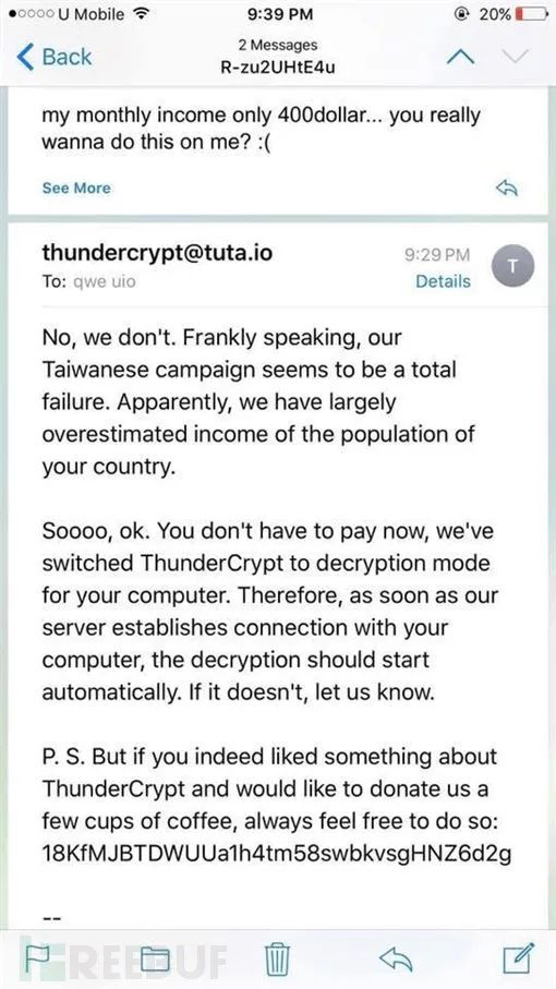 遥测数据显示,ThunderCrypt首次出现于2017年4月23日,活动的主要高峰期出现在随后的5月份。有趣的是,因为一件趣事它引起了中国台湾新闻网的注意。据报道,一名中国台湾网民因无法支付0.345比特币的勒索赎金以换取解密内容,决定通过提供的支持电子邮件地址与攻击者联系。他在邮件中坦率地解释了面临的困境,称其月收入只有400美元。令许多人吃惊的是,攻击者回复承认高估了中国台湾民众的收入,这次攻击被认为是一次彻底失败的尝试。