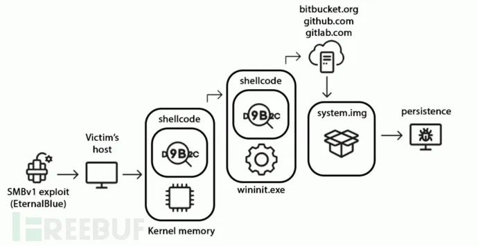 第一个检测到的shellcode位于WININIT.EXE进程中,该进程能够从bitbucket[.]org下载二进制文件,并执行PowerShell脚本。在最初发现时,感染媒介是未知的。然而,随着调查的逐步深入,研究人员发现了一个与EternalBlue非常相似的SMBv1漏洞。