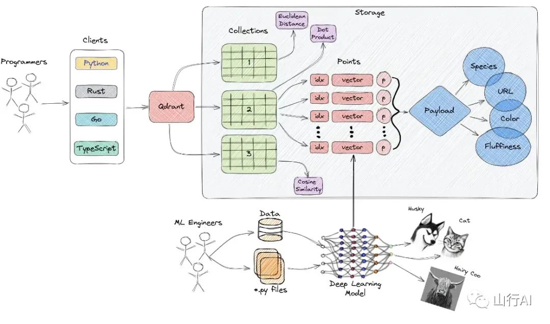 Qdrant[1]是一个专业的矢量相似度搜索引擎,旨在通过用户友好的API提供一种供生产使用的服务。它便于存储、搜索和管理点(向量),以及附加的有效载荷。这些有效载荷作为补充信息,提高搜索的精确性,并向用户提供有价值的数据。 使用Qdrant非常简单。您可以使用Python qdrant-client,访问最新的Qdrant Docker镜像并建立本地连接,或者在准备好进行全面过渡之前,探索Qdrant的云免费套餐选项。