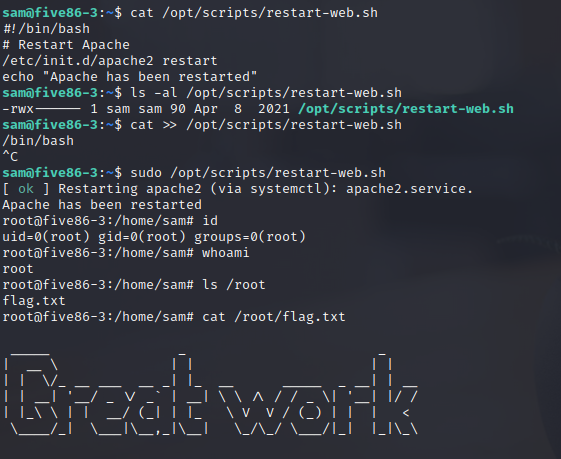 发现该脚本是直接可写,将/bin/bash写入,用sudo运行拿到root权限
