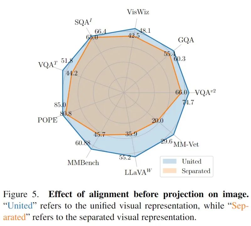 研究结果显示,统一的视觉表示在图片理解方面展现出强大的性能。它在5个图片问答数据集和4个基准工具箱上都明显优于分离的视觉表示。此外,团队还发现,在POPE、MMBench、LLaVA-Bench和MM-Vet这四个基准工具箱上,统一的视觉表示相较于分离的视觉表示有着显著的优势。这凸显了预先对齐视觉表征的好处,它不仅提升了图片问答性能,还在其他图片理解任务中带来了诸如减小幻觉和提升OCR能力等方面的收益。