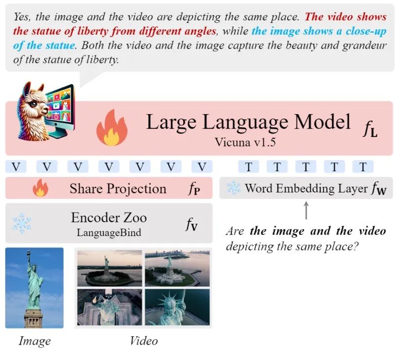 如下图所示,Video-LLaVA成功地识别出自由女神像的图片是近景且细腻的,而视频描述了自由女神像的多个角度,表明它们来自同一个地方。