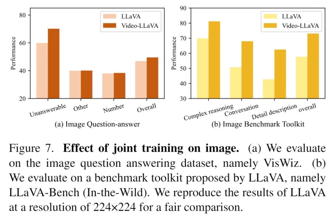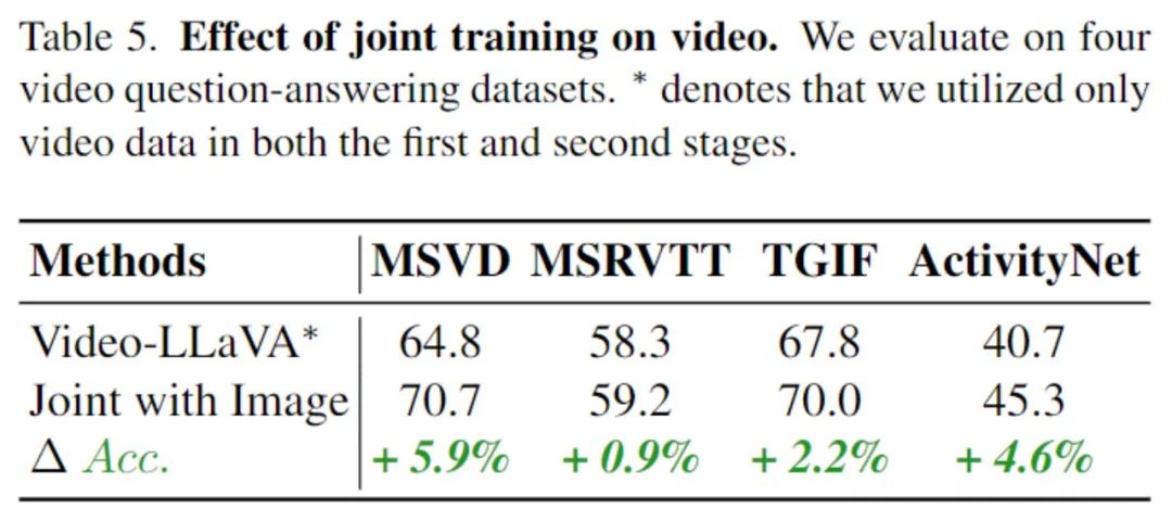 在视频理解方面,对4个视频问答数据集进行评估。与仅在视频数据上进行训练的Video-LLaVA模型相比,联合训练图片和视频的模型在这4个数据集上全面取得了更好的表现。这些结果表明,联合训练图片和视频能够促进LLM对视觉表示的理解能力。通过同时学习图片和视频的信息,模型能够更全面地理解和表示视觉内容,从而提高在视频问答任务上的性能。这证实了联合训练图片和视频的益处,对于增强LLM对视觉信息的理解具有积极的影响。