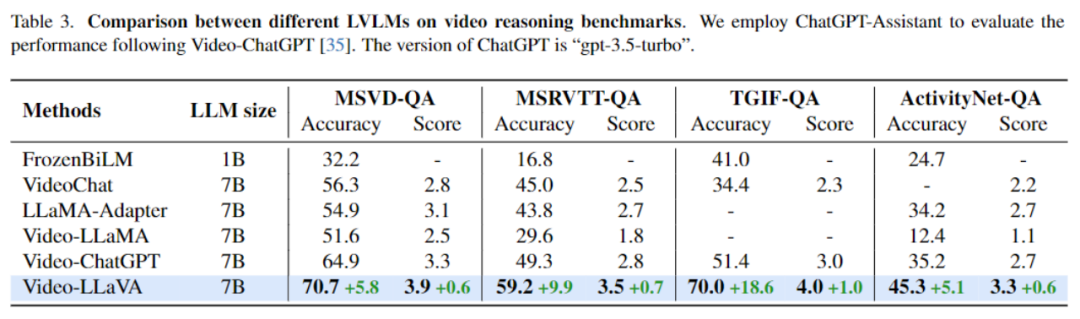 如表3所示,Video-LLaVA在4个视频问答数据集上全面超过了Video-ChatGPT,并且涨幅相当可观。