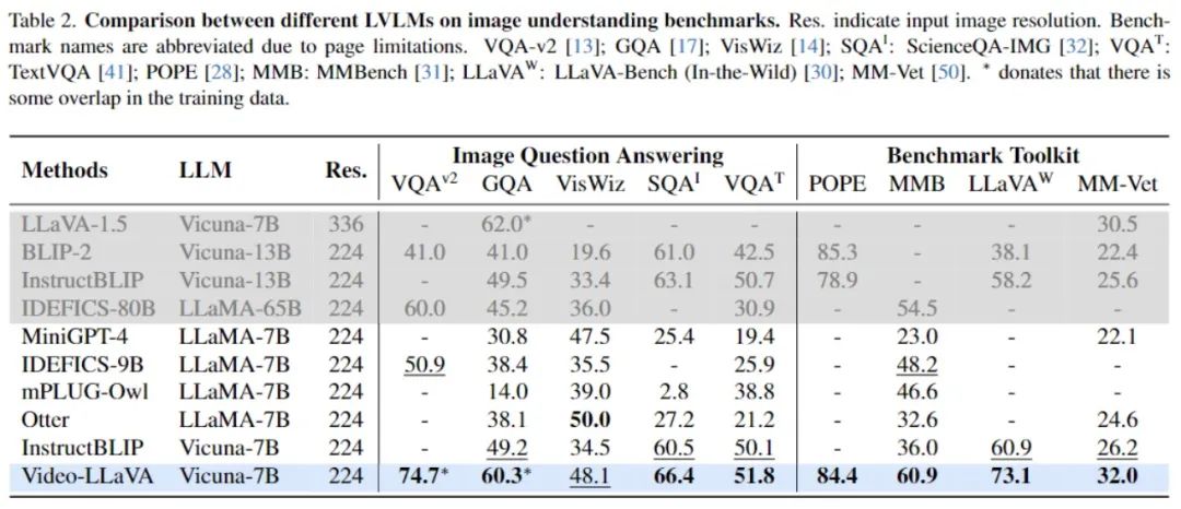 图1 Video-LlaVA在图片,视频上的13个基准上达到先进的性能