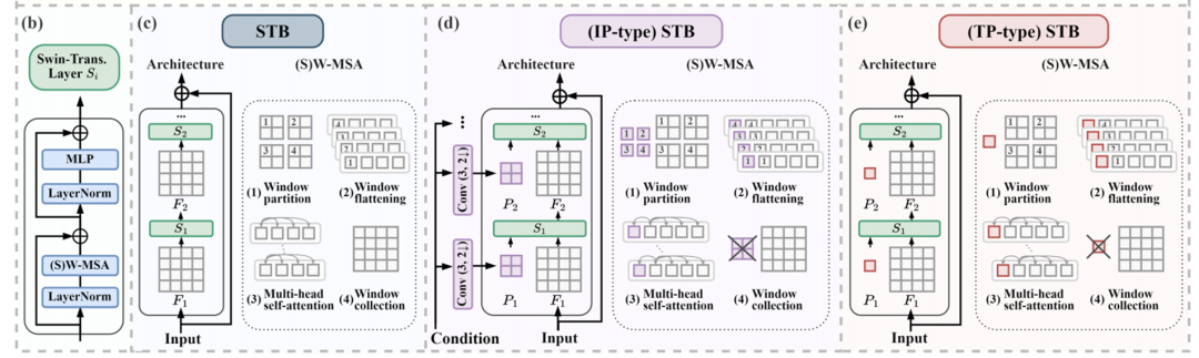 STB 是模型设计的核心。图 3(c) 详细说明了其数据处理流程。它由多个Swin-Transformer 层组成(图 3(b))。