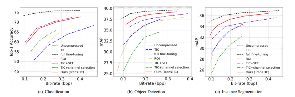 图 5 展示了由竞争方法产生的解码图像和相应的比特分配图。如图所示,针对人类感知进行优化的基本编解码器 TIC 往往会花费更多的比特来编码复杂区域(例如图 5(a)中的岩石表面和图 5(b)中的背景森林),这可能与下游识别任务不太相关。相比之下,TransTIC 和其他针对机器任务优化的方法将更多位从背景转移到前景,从而产生更清晰的前景物体。