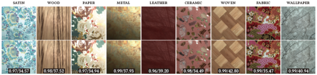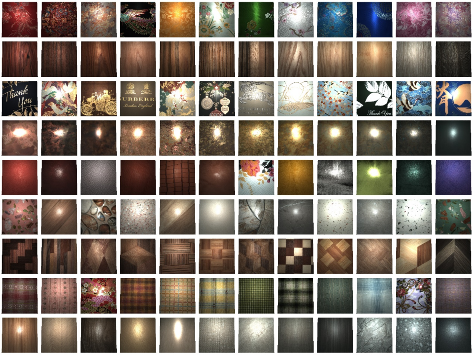 这是第一个大规模 6 维 SVBRDF 的实测数据库,共有 1,000 个高质量平面样本,空间分辨率为 1,024×1,024,等效为超过 10 亿个实测 BRDF,涵盖了包括木材、织物和金属在内的 9 种类别。