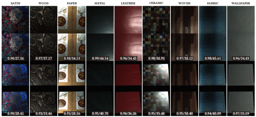为了证明重建结果的正确性,研究人员将主视角下的照片(下图第一行)和神经表达绘制结果(下图第二行)进行了比较。定量误差(以 SSIM/PSNR 表达)标注在绘制图片的底部。由下图结果可见,本系统实现了高质量材质重建(SSIM>=0.97, PSNR>=34db)。