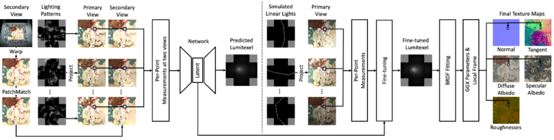 本系统创新性地结合了当前基于网络预测和基于微调两大类流行方法的优点,既能通过可微分光照图案优化来增加物理采集效率,又能通过微调来进一步提升最终结果质量,从而首次实现了对于平面 SVBRDF 的高鲁棒性、高质量以及高效率的采集重建。