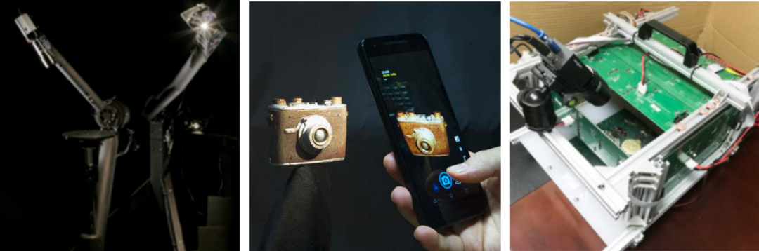 图 2:现有材质采集研究的代表工作。从左到右分别是 [Lawrence et al. 2006],[Nam et al. 2018] 以及 [Kang et al. 2018]。其中 [Kang et al. 2018] 为该团队在 2018 年发表于 ACM SIGGRAPH 的早期工作。