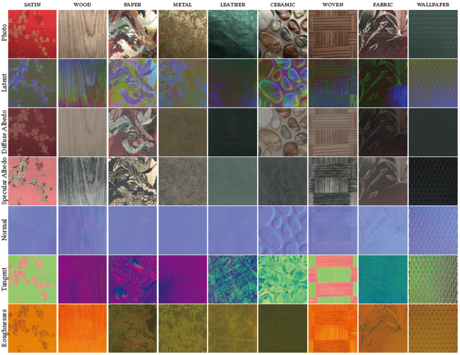 在计算图形学领域,材质外观刻画了真实物体与光线之间的复杂物理交互,通常可表达为随空间位置变化的双向反射分布函数(Spatially-Varying Bidirectional Reflectance Distribution Function,缩写为 SVBRDF)。它是视觉计算中不可或缺的组成部分,在文化遗产、电子商务、电子游戏和视觉特效等领域中有着广泛的应用。