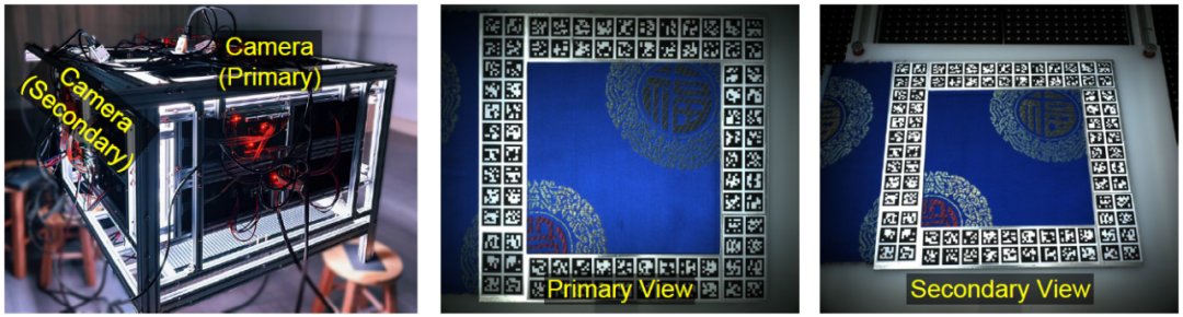 为高效扫描材质外观,研究团队搭建了一个接近半立方体的近场光照多路复用设备,其尺寸约为 70cm×70cm×40cm。样本被放置在一块透明的亚克力板上,可以通过抽屉滑轨快速滑入 / 滑出,来实现高吞吐率。该设备由 2 台机器视觉相机和 16,384 个高亮度 LED 组成,两台相机分别从大约 90 度(主视角)和 45 度(次视角)的角度拍摄样本,LED 分布在设备的 6 个面上。自主研发的高性能控制电路负责对每个 LED 进行独立亮度控制,并在硬件层面实现了光源投射和相机曝光的高精度同步。
