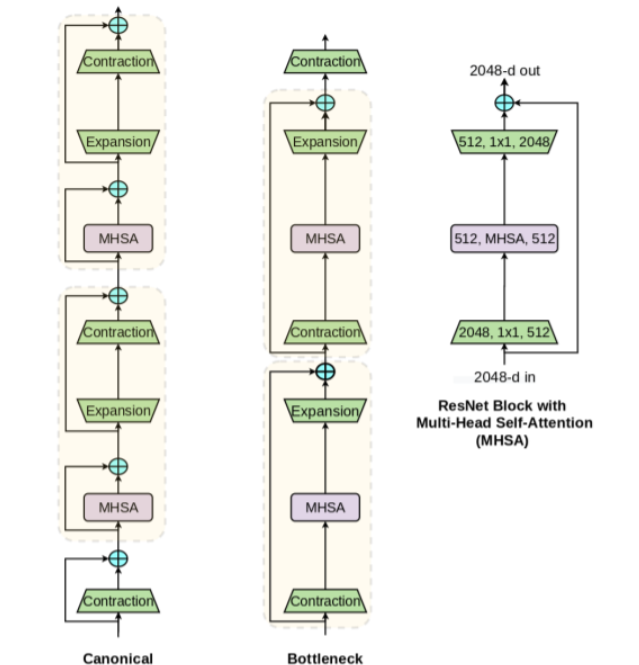 本文的一个关键信息是,具有多头自注意力(MHSA)层的ResNet瓶颈块可以被视为具有瓶颈结构的Transformer。下图直观地解释了这一点,作者将此块命名为瓶颈转换器(BoT)。除了图中已经可见的差异(残差连接和块连接)之外,还有一些差异:(1)Normalization:Transformer使用LN,而BoT 使用BN,这在ResNet瓶颈块中是典型的;(2) 非线性:Transformer在FFN块中使用一个非线性函数,而ResNet结构允许BoT块使用三个非线性函数;(3) 输出投影:Transformer中的MHSA块包含输出投影,而BoT块(图1)中的MHSA层(图4)不包含输出投影;(4) 使用SGD和动量优化器(通常用于计算机视觉),而Transformer通常使用Adam优化器]进行训练。